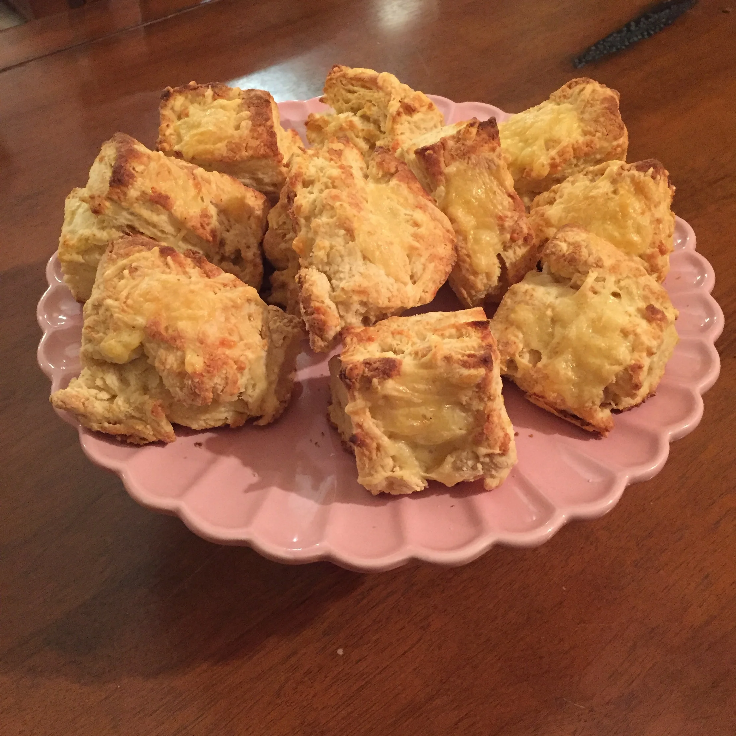 After a couple of speed bumps, ie, not putting enough milk into the mixture to start with, making for a very floury dough, as well as having 10 cooked scones with two persistent undercooked ones, I managed to extract 12 perfectly cooked cheese scones, with not an ounce of charcoal in sight (don't flip them over please).