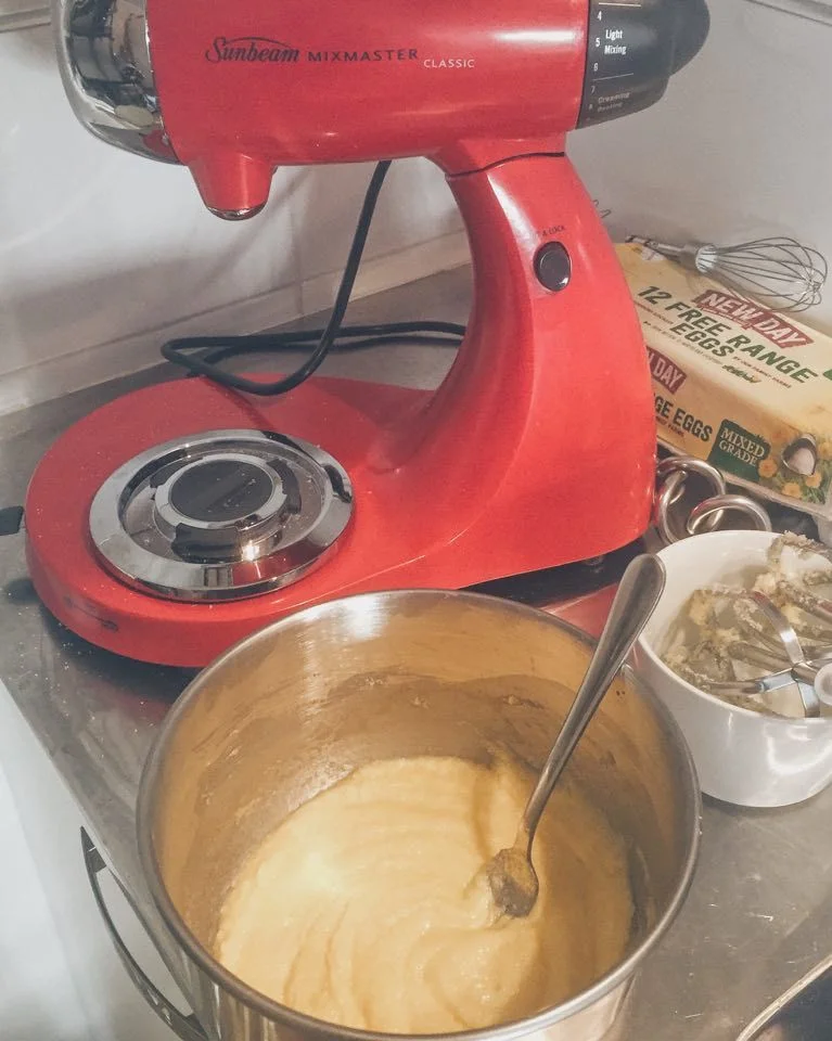 And then it was wet ingredients time! I had a brief battle with the cake mixer where I learnt that you need to clip in two utensils, not just one, as if you just use one it just flings the butter to the sides of the bowl and no mixing and softening of the butter will occur … yeah, OK, I hear you saying duh … Oh, and don’t try and use a fork to scrape the butter off the side of the bowl and fling it towards the beater, because I have now learnt that just results in a bent fork.